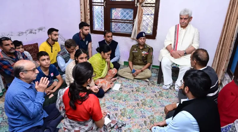 Sinha informed about providing government job to the wife of Kashmiri Pandit Puran Krishan Bhat after meeting his family members at their residence in Jammu.