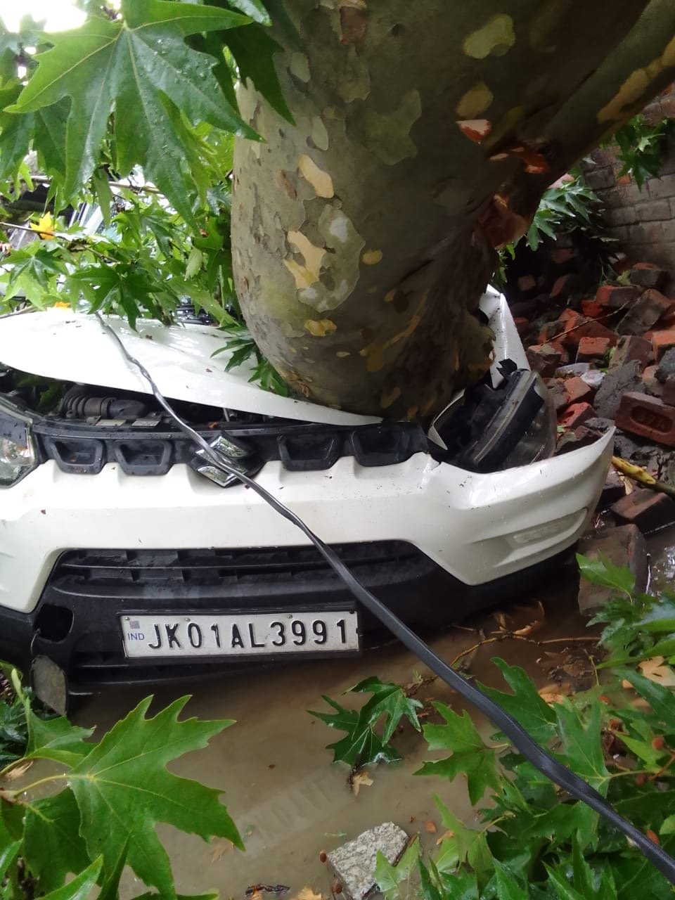 A powerful windstorm swept through Srinagar , causing widespread damage across several areas. Many rooftops were blown off, and dozens of vehicles were crushed, particularly in the Burzullah locality.