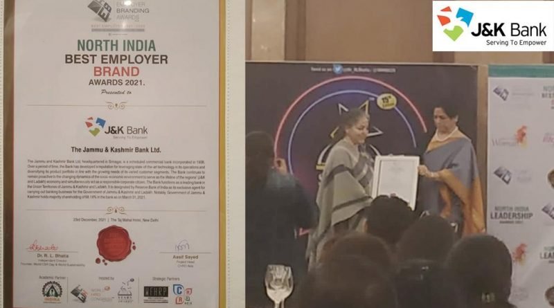 SRINAGAR, DECEMBER 23: As a significant acknowledgement of its HR development, J&K Bank bagged ‘Best Employer Brand Award’ in ‘The North India Best Employer Brand Awards 2021’ featuring the top organizations from North India region, which are exemplary in HR and have used marketing communications effectively for Human Resources Development.