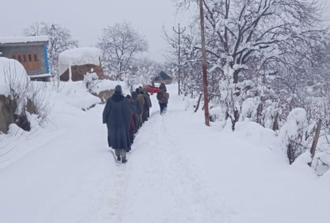 The local residents said that the snow clogged road forced the family members to shift her to the hospital on a stretcher.