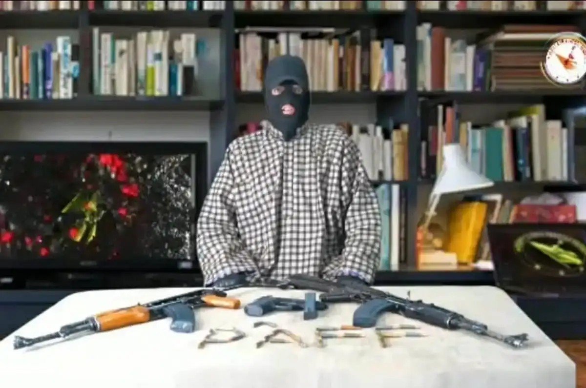 The man attired in a pheran spoke in Kashmiri. Two AK rifles and several rounds of ammunition were placed on a table in front of him while the background displayed a book shelf.